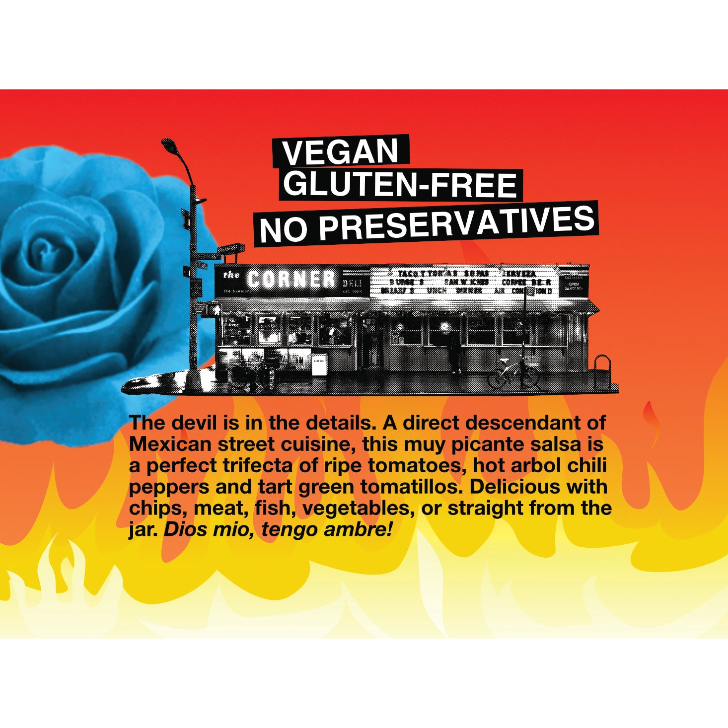 The devil is in the details. A direct descendant of Mexican street cuisine, this muy picante salsa is a perfect trifecta of ripe tomatoes, hot arbol chili peppers and tart green tomatillos. Delicious with chips, meat, fish, vegetables, or straight from the jar. Dios mio, tengo hambre!